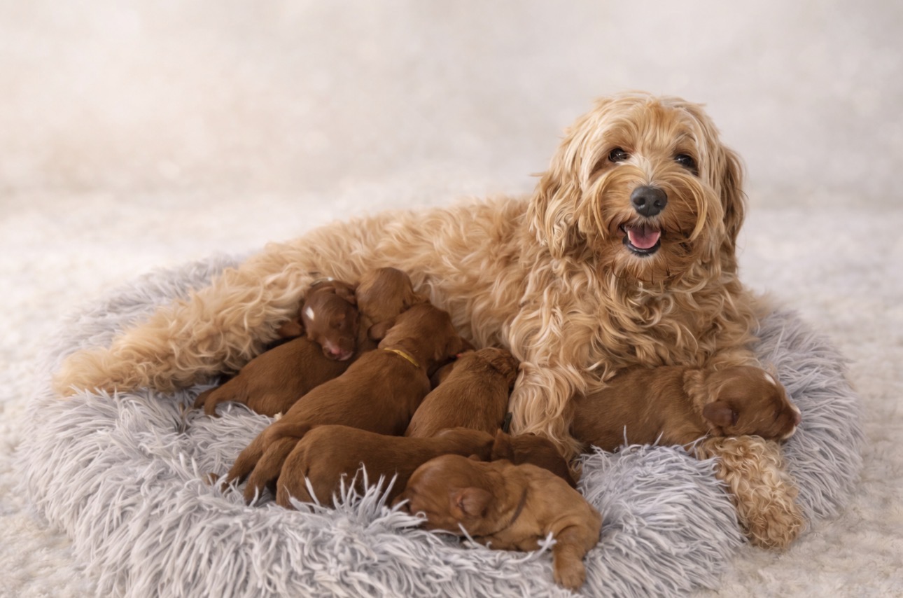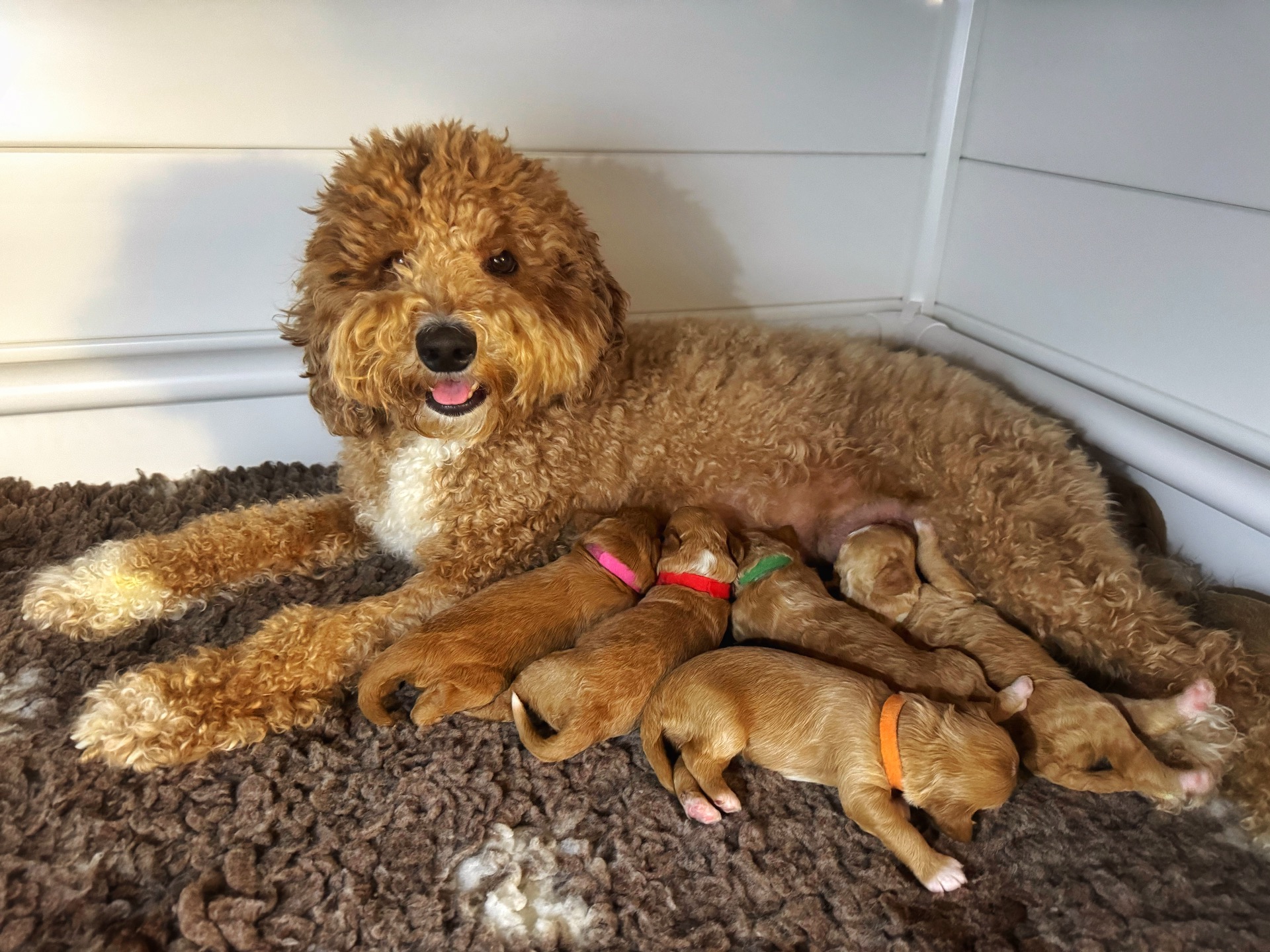 Our sweet Mia has become the mother of eight sweet puppies. The father is the handsome red male Animosa's Doodles Charlie-Chaplin.